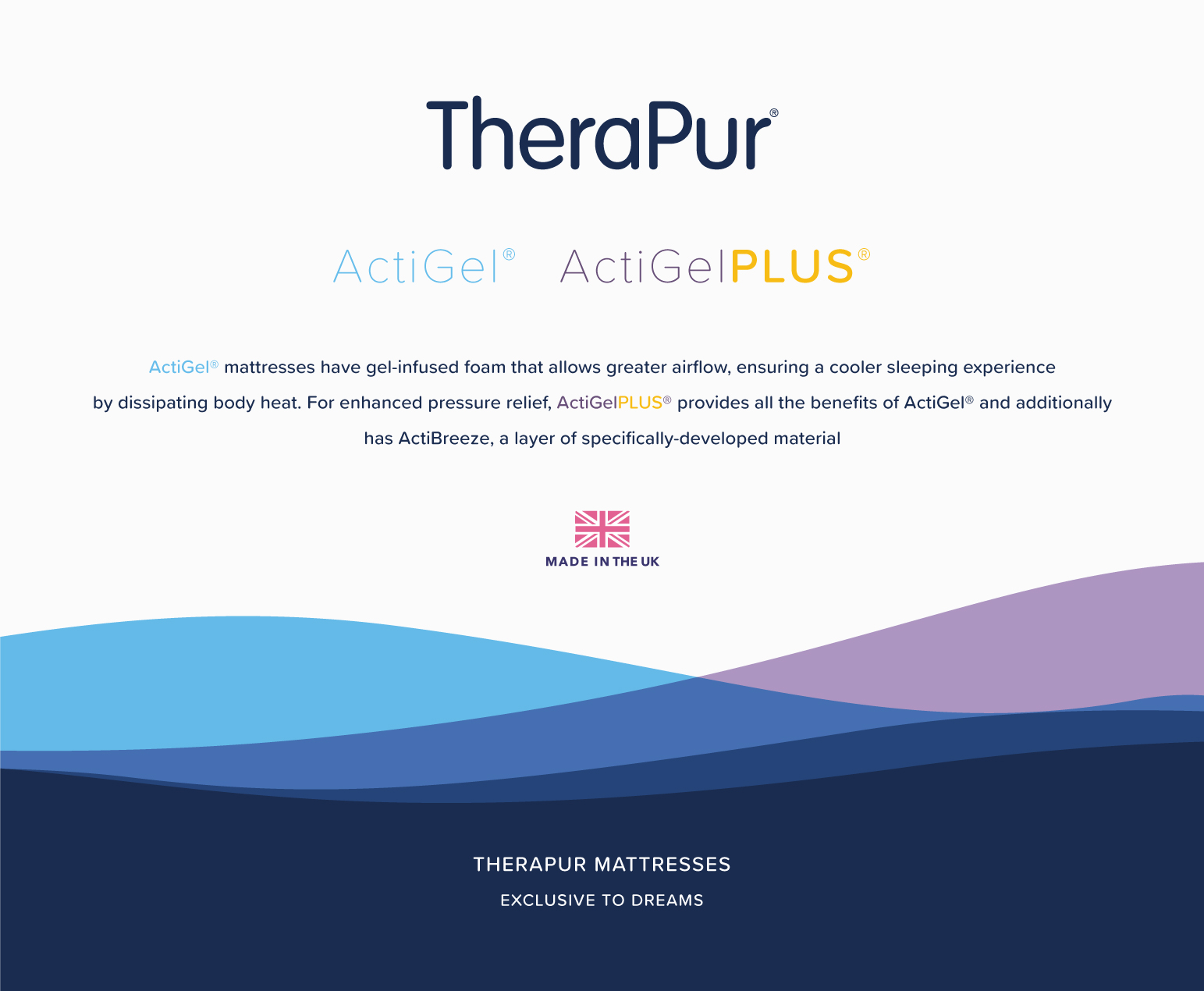 Therapur, "products that rival the best". Airflow is essential for a good night sleep and to ensure the longevity of your mattress. This message is at the core of the brand and by using the airflow wave graphics I have enforced this as well as the fluidity of the gel infused foam. a palette of fresh bright accent colours were used within the brand to allow stand out against the brand blue.