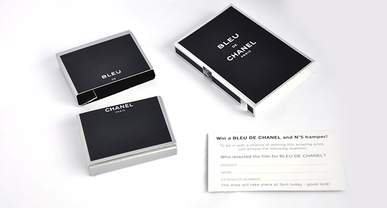 Bleu de CHANEL: I designed a number of printed cards and small tester fragrance packaging to help promote this new fragrance launch. Working with the design team in France to ensure that the final product met their high expectations for the UK market.